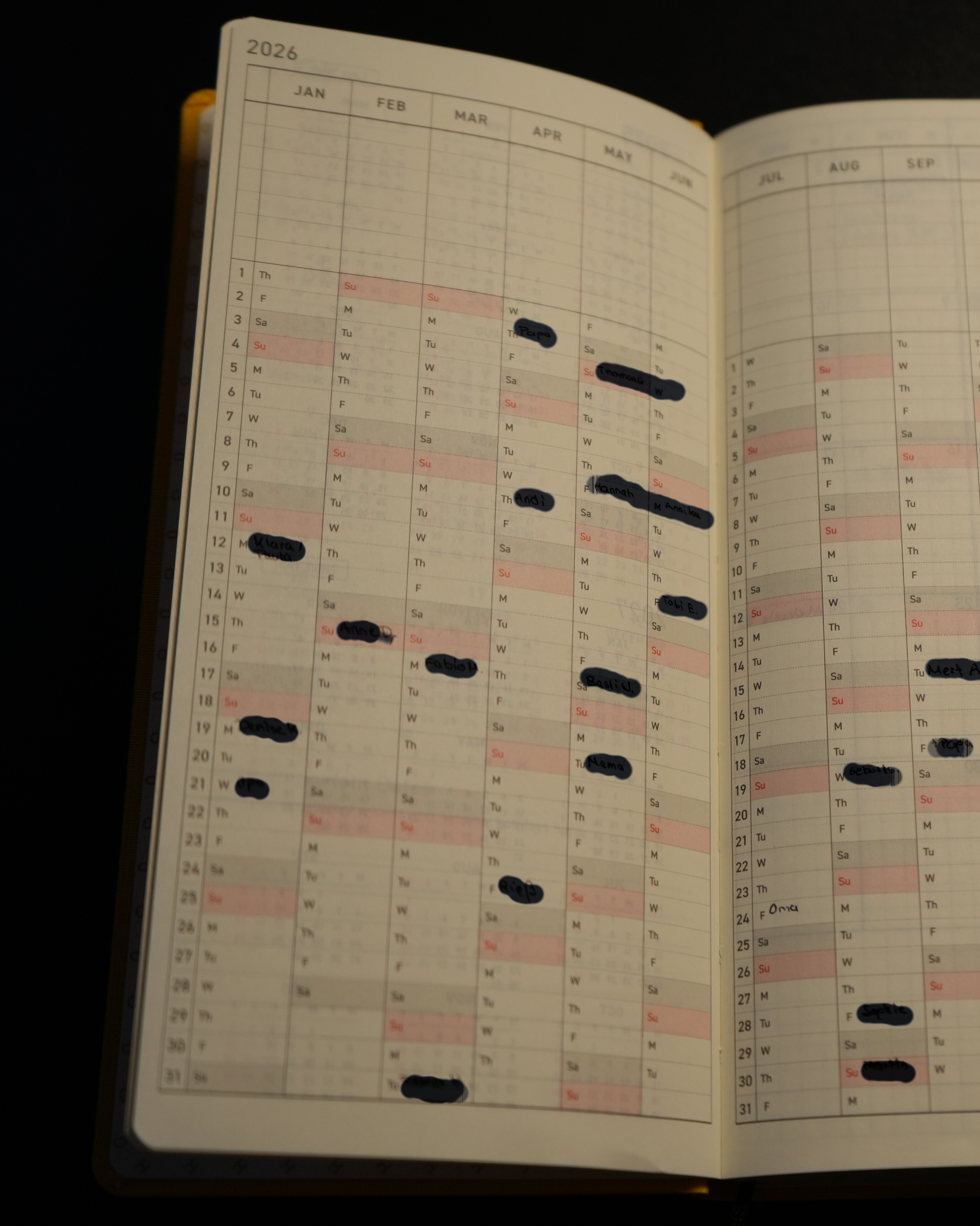 Hier ist das gesamte Jahr auf 2 Seiten für einen schnellen Überblick abgebildet. Ich benutze die Jahresübersicht daher ausschließlich für Geburtstage und für Farbcodes (Urlaub, Feiertage, Müll, Hausordnung).